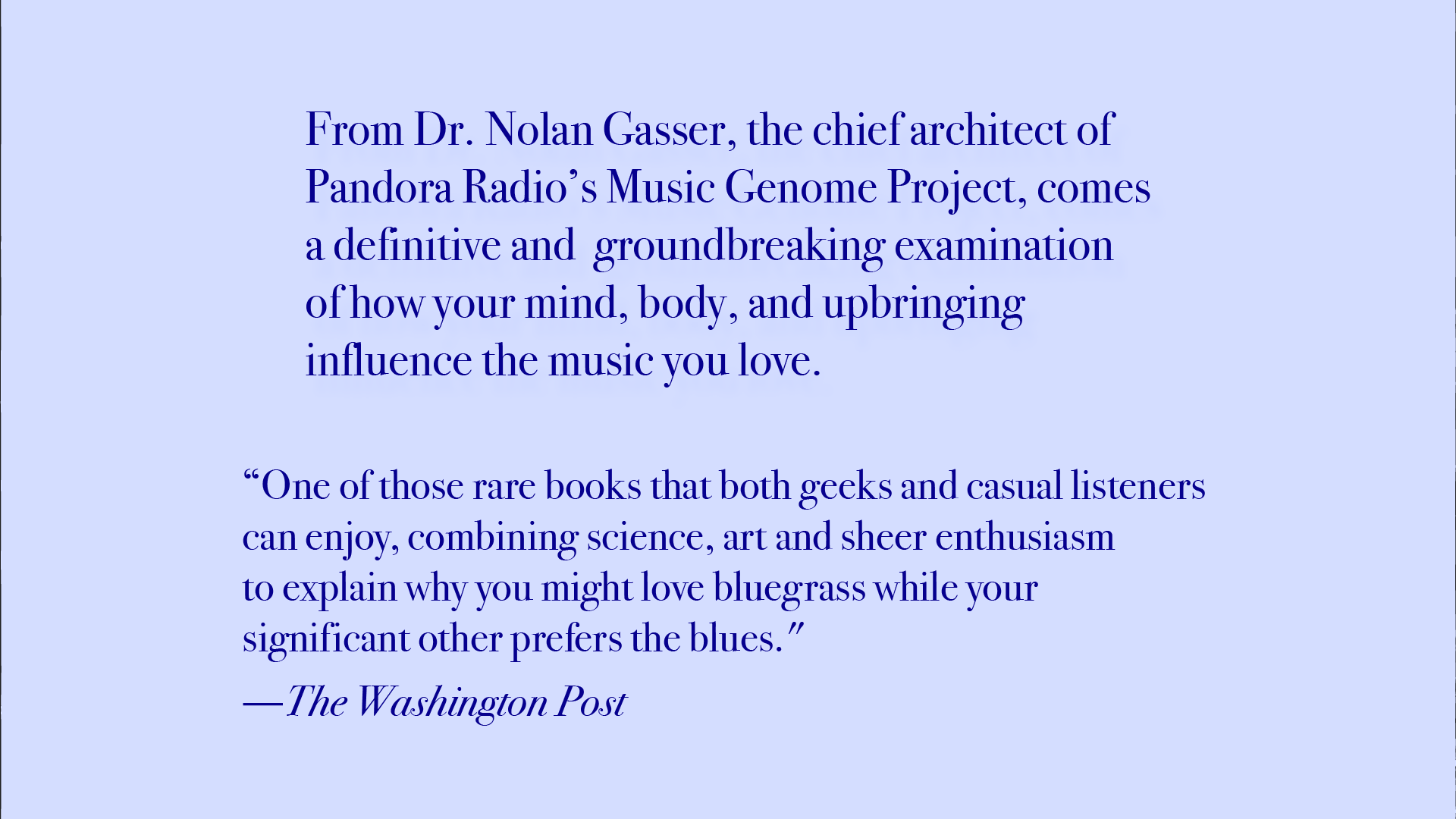 From Dr. Nolan Gasser, the chief architect of Pandora Radio’s Music Genome Project, comes a definitive and groundbreaking examination of how your mind, body, and upbringing